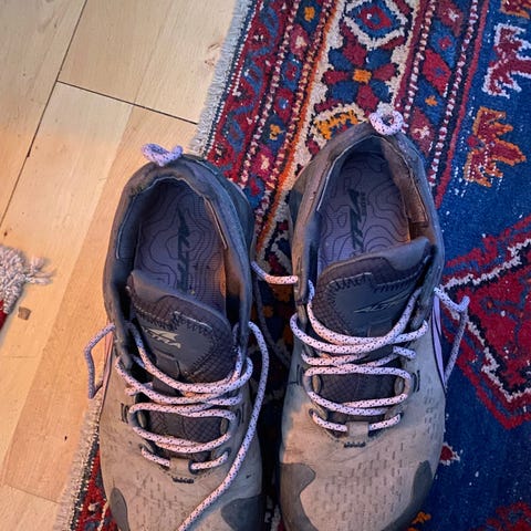 De har været brugt til få vandreture i Danmark en sæson, og er i virkelig god stand! Eneste slid er et lille stykke øverst på fronten, mesh stykket, se foto.