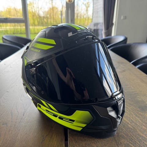 MT Helmets fuldface motorcykelhjelm i sort med neongule detaljer og klart visir. Har justering i siden og ventilationsåbninger foroven.
