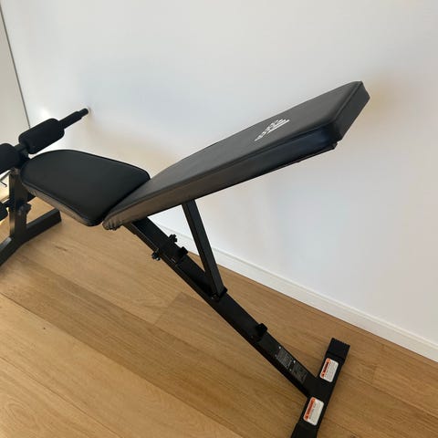 Justerbar træningsbænk i sort med polstrede benruller foran. God til mave- og styrkeøvelser og nem at flytte rundt på gulvet.