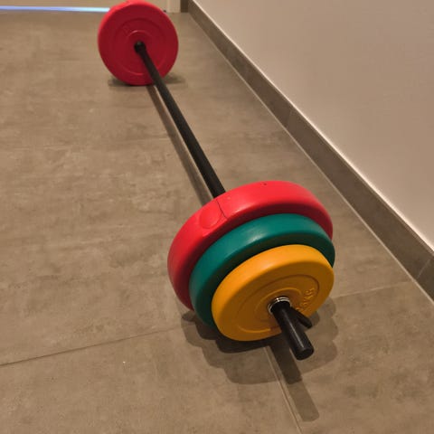 Vægtstang med farvede vægtskiver i forskellige kilo til hjemmetræning. Stangen har greb i midten og skiverne kan tages af og på efter behov.