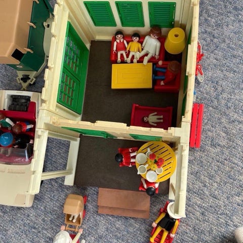 Hus i 2 etager med dukker, møbler mm