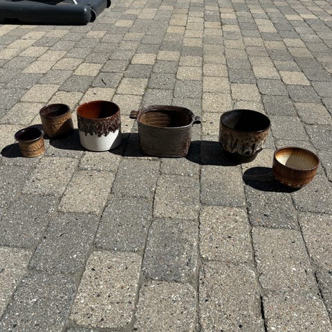 2 stk. højde 10 cm / diameter 12 cm. Den ene af disse er 2. sortering. Har et lille, diskret hak/glasurfejl i kanten (se billede).