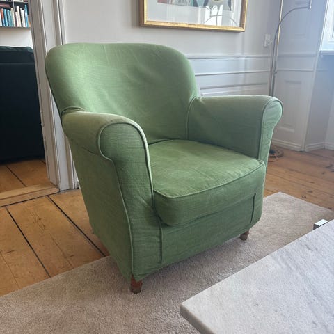 Italiensk læderstol. Købt hos Anton Dam møbler på gammelkongevej på Frederiksberg fra en del år tilbage. Nypris var 20.000 kr. Trænger til lige at få en omgang sort læderfedt, men ellers i god stand.