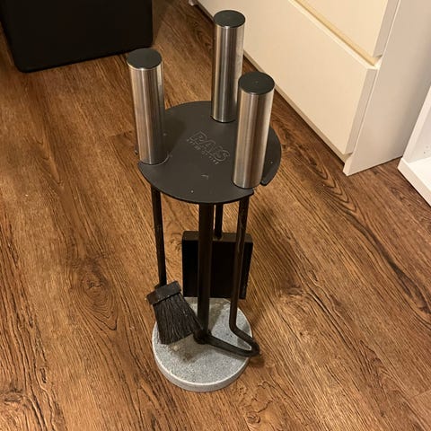 Pejssæt i metal med stativ og flere redskaber. Har blandt andet kost, skovl og andre værktøjer til pejsen, som hænger på holderen.