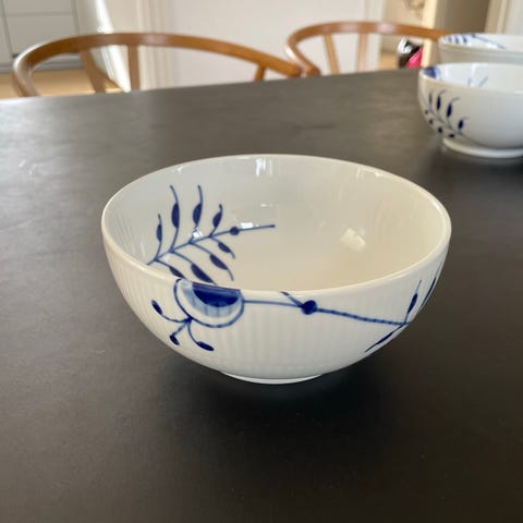 Royal Copenhagen skål i hvid med blå dekoration. Riflet struktur på ydersiden og klassisk blåmalet mønster rundt om skålen.