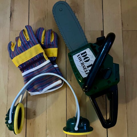 Kædesav med lydeffekt. Skruemaskine til batteri. Diverse øvrigt værktøj.