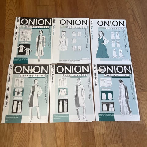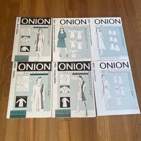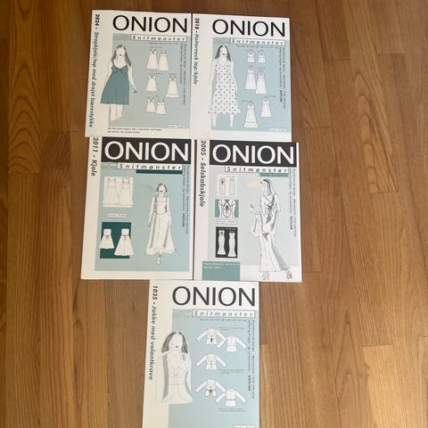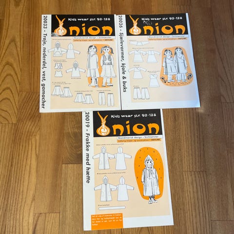 3 stk. Onion symønstre til børn str. 122-158 med kjole, buksedragt, haremsbukser, trøje, nederdel, vest og gamacher. Tegningerne viser flere forskellige modeller og længder, så der er lidt at vælge imellem.