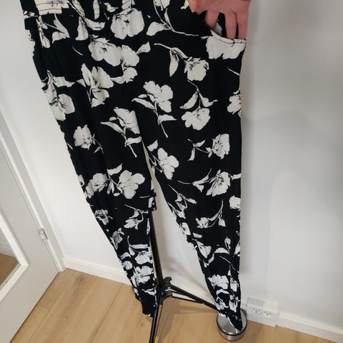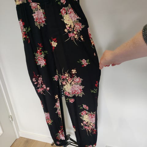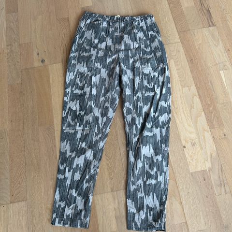 Let luftig stof. Elastik og snøre i livet. Bliver smallere mod ankel, dog uden elastik ved ankel. Str s/m