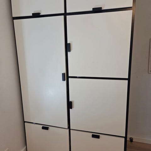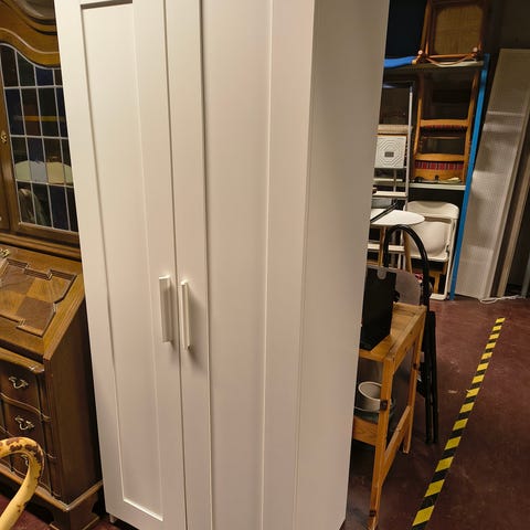 hvid tøjskab med hylder, skuffer og bøjlestang