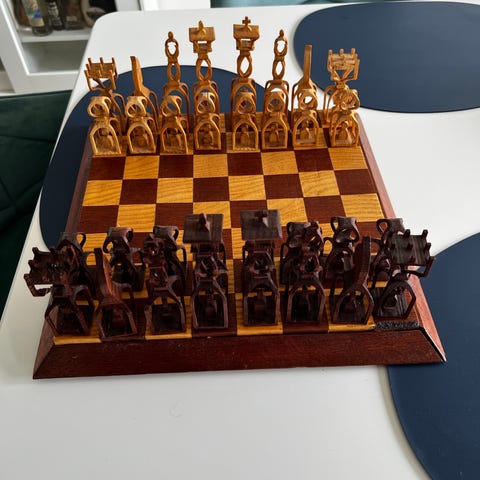 Skakspil med detaljerede figurer på træbræt