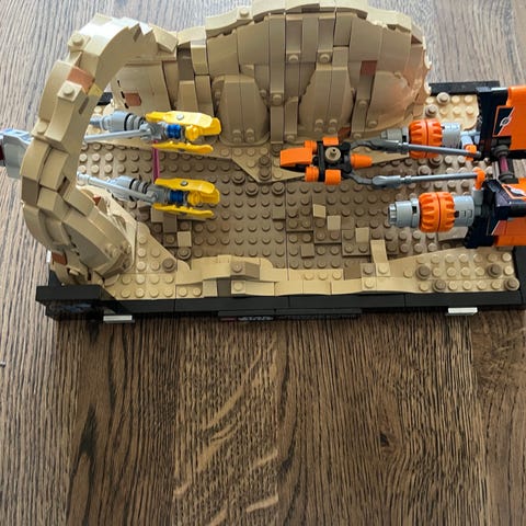 LEGO Star Wars Tatooine scene med lille landskab og figurer bygget på plade. Instruktionshæfte og æske medfølger på billederne, med detaljerede trin og billeder af modellen.