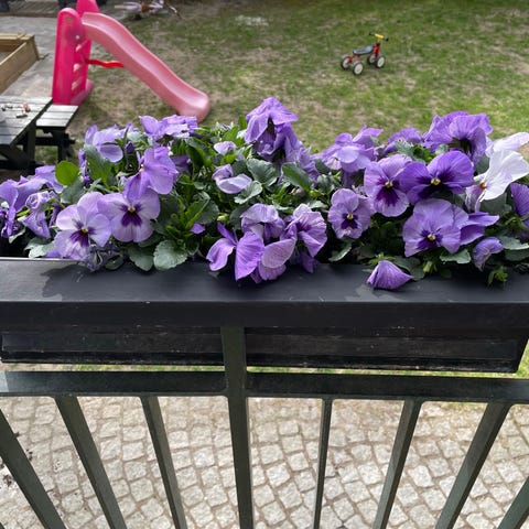 Flot trækasse med patina, ideel til blomster og planter på altanen. Nem at flytte rundt takket være hjul.