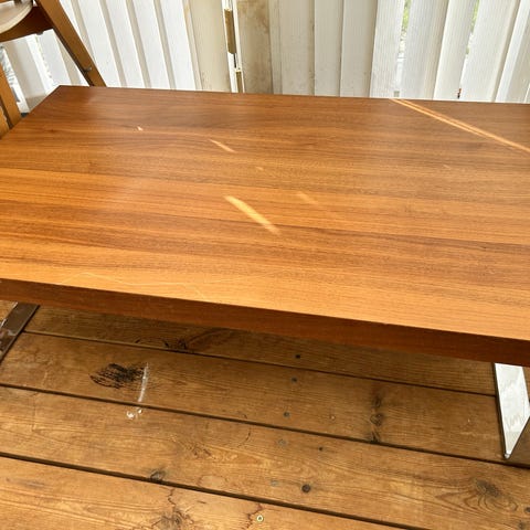 Sofabord i træ, med brugstegn i form af skjolder fra vand. Har to længder, da bordpladen kan forlænges.