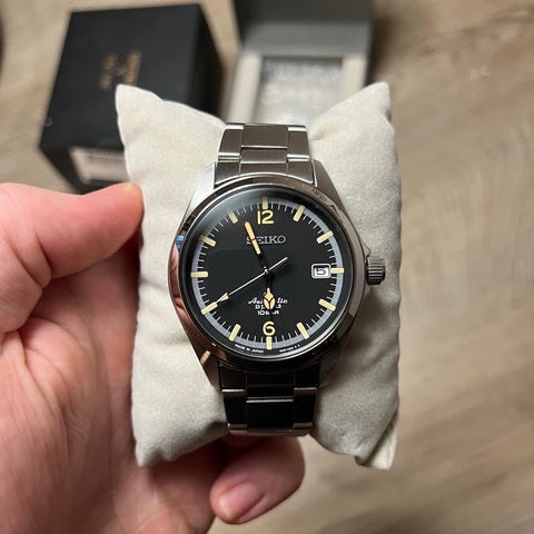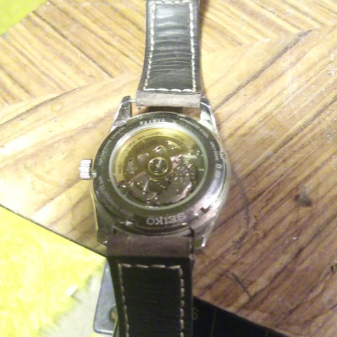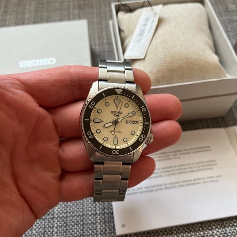 Seiko automatisk herreur med grøn skive og dato ved kl. 3. Stållænke med foldelås og gennemsigtig bagkasse, så værket kan ses.model apinist spb155j1.uret er fra 2021 og kommer som kompletset.6r35værk med 70timers gangreserve.uret måler 38mm