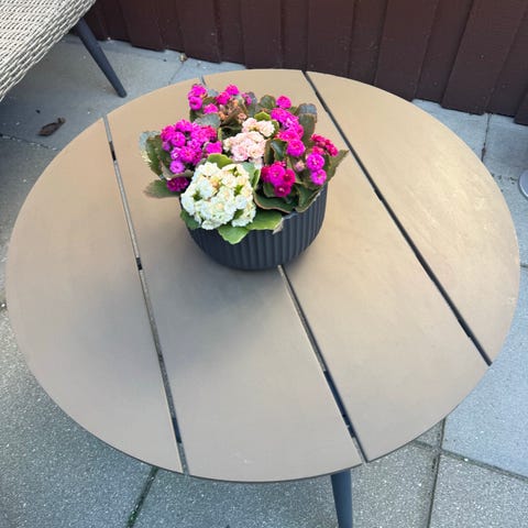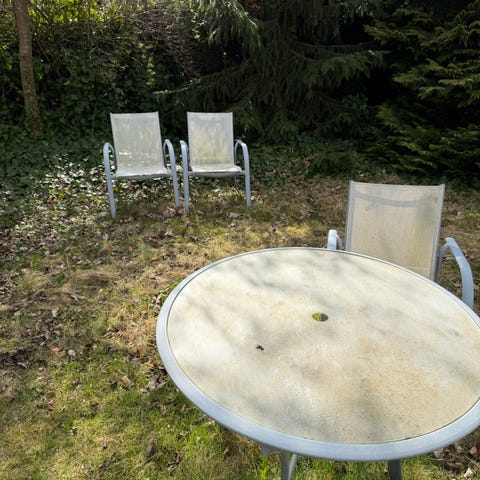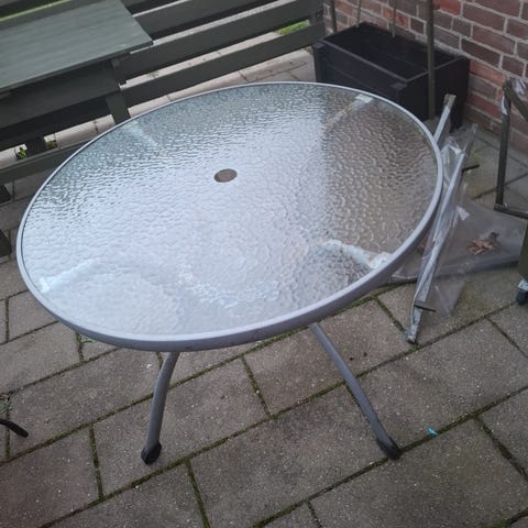 Grønt bord 90 cm og 4 grønne stole. Bordet har hul i midten til en parasol og har skruben, så det kan stå stabilt selv på ujævne steder