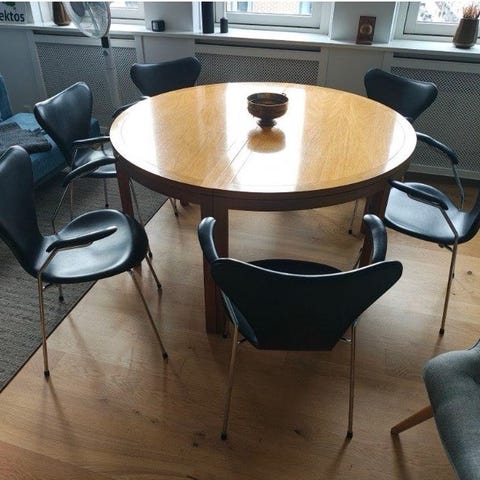 Dejligt fleksibelt spisebord i træ med plads til 8-10 pers. når det har begge plader i og de 2 buede ender sat på.