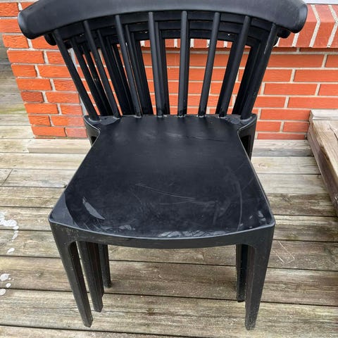 To sorte plaststole med buet ryg og armlæn, gode som ekstra stole inde eller ude. Let at tørre af og flytte rundt på, da de er lavet i ét stykke plast.