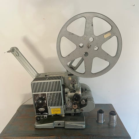 Elektrisk slide-projektor med støbt metalkabinet og glaskonstruktionslinse.
