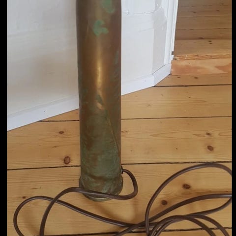 Patineret granat hylster i messing, forberedt så de kan anvendes som lamper. Med lidt pudsearbejde kan de blive helt blanke.