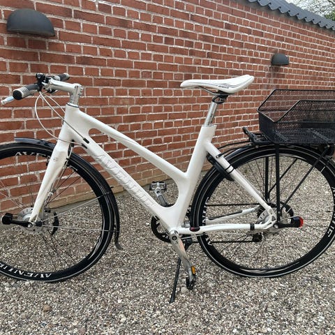 Avenue Broadway citybike damecykel i perlemors hvid med 53 cm stel og 28" hjul. Har kurv foran, eftermonteret bagagebærer, skærme, håndbremse for og bag og 7 gear med betjening på styret.
