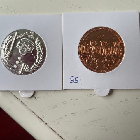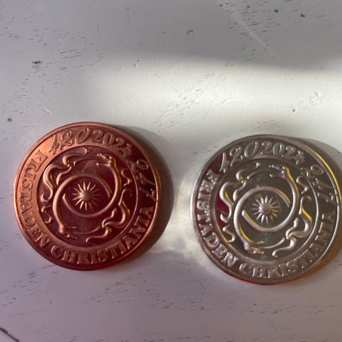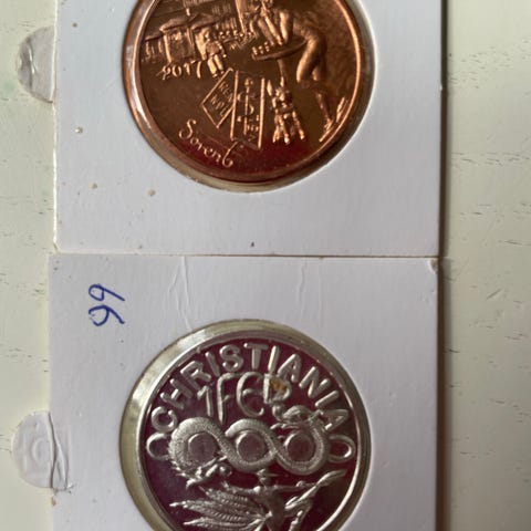 Sæt med to Christiania mønter 50 års jubilæums mønter, en i sølv og en i kobber. De er større end de “normale” Christiania mønter, pga jubilæet. Fra 2021.