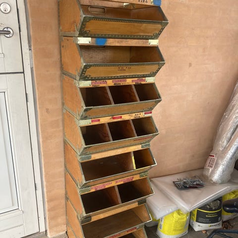 Raaco metalreol med flere plastbakker og åbne hylder til opbevaring af småting. Står på en bundplade i træ og er klar til montering i f.eks. værksted eller varebil.