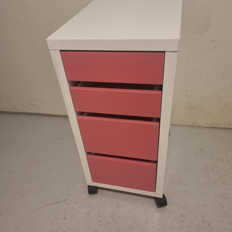 Reol med to hylder og tre skuffer.