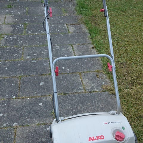 Einhell plænelufter til 220v strøm med opsamler. Virker fint.