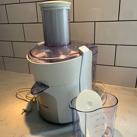 Philips juicemaskine med tilhørende. Nem at skille ad og samle igen, så den er lige til at bruge i køkkenet.