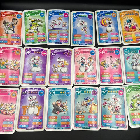 Italian Brainrot samlekortspil med forskellige figurer og motiver. Flere kort med farverige illustrationer og stats, klar til at blive spillet med eller byttet.