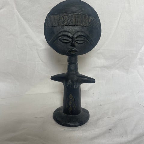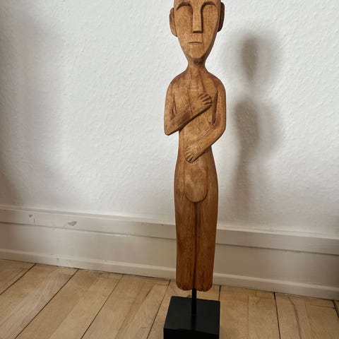 Fin udskåret træfigur af en person på lille firkantet sokkel. Har detaljeret ansigt og dekoration omkring midten i metalfarve.