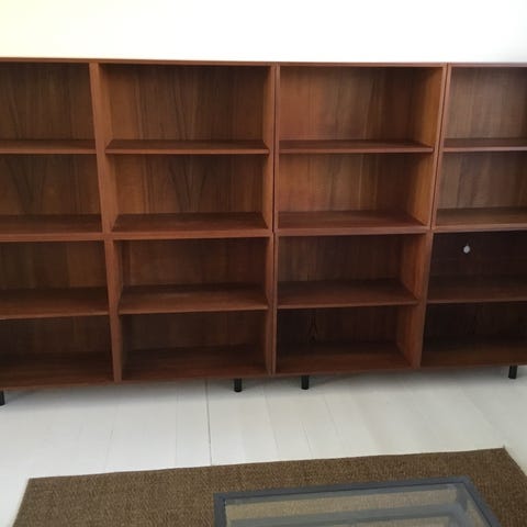 Virkelig smuk reol i teak træ. Har alderssvarende brugsspor - ville have godt af noget olie. Dette er et lille hul i pladen midtfor pga. ledning.