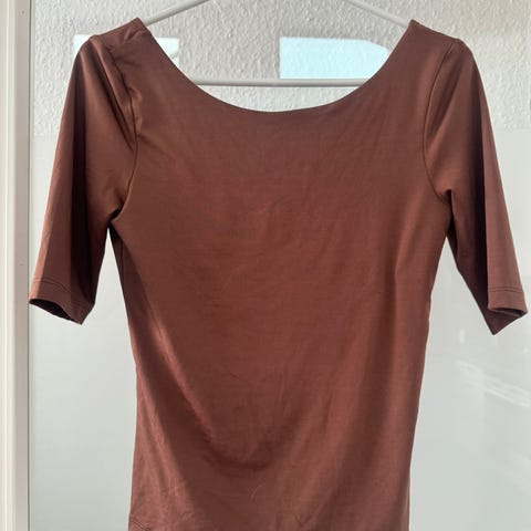 Brun langærmet bluse fra ONLY i str M model PGLONE 2WAY, i polyester med lidt elastan. Tætsiddende top med bred udskæring foran eller bagpå, kan vendes begge veje. glat stof uden mønster.