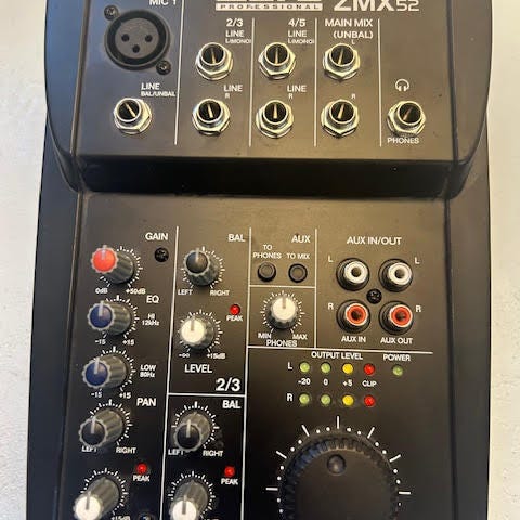 6-kanals blandekonsol med to mikrofonindgange, to mono-indgange og to stereoinputindgange