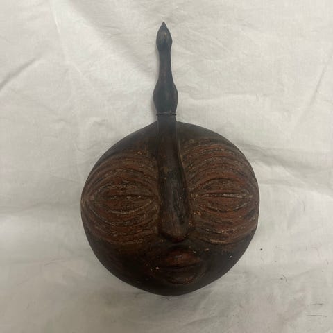 Fin lille træmaske med udskåret ansigt og malede brune og sorte nuancer. Har hul og snor bagpå, så den kan hænges op på væggen.