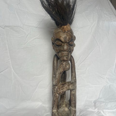 Håndskåret træmaske med hårpynt