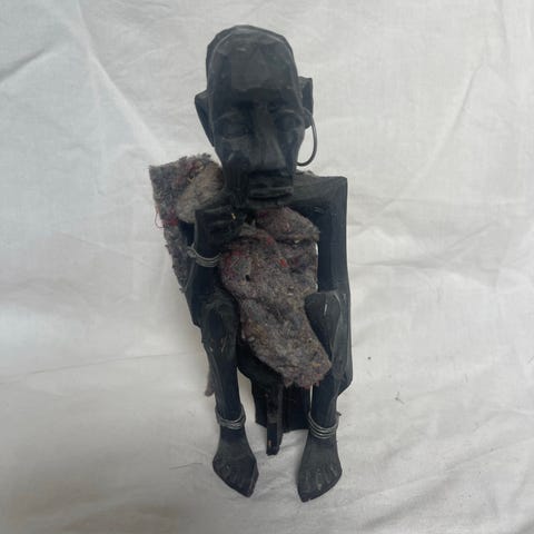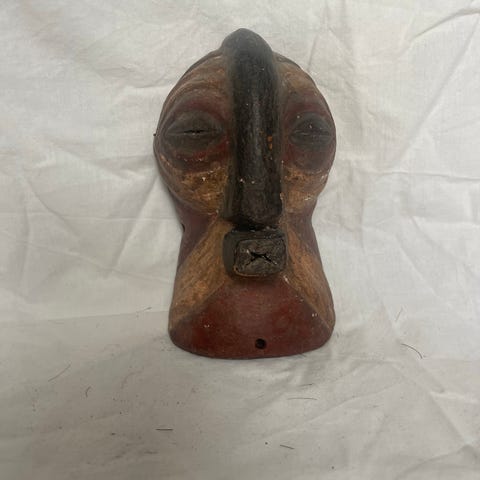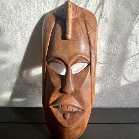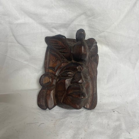 Lille håndskåret træmaske med markerede ansigtstræk. Har mørkt hår øverst og fine udskæringer i træet.