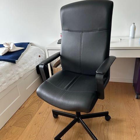 Fin kontorstol, hvor man ikke bliver for varm, da der er net ryglæn. Den er god høj i ryggen. Fejler intet, vi har bare ikke plads til den.