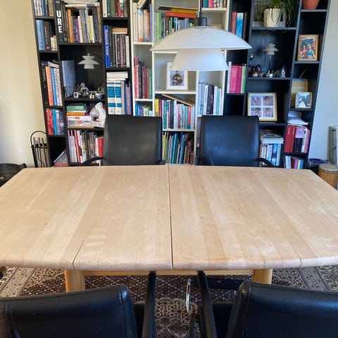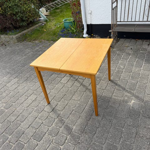 Der er almindelige brugsspor i bordpladen (se billeder), men det fremstår stadig pænt og kan eventuelt slibes let, hvis man ønsker et helt nyt udtryk.