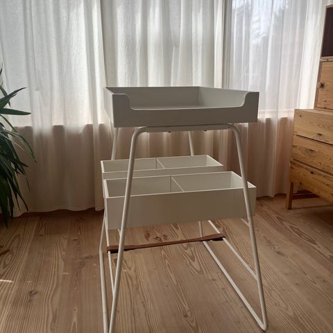 Sebra puslebord i hvid med tremmekant og to hylder under til opbevaring. Lidt misfarvning på toppen og skrammer hist og her som det fremgår af billederne - ellers fin stand.