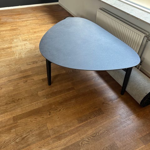 Katrine Nordic, Rund/Dråbeformet med hylde, linoleum bordplade, ben mørkolieret eg.