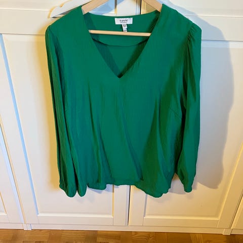 Blå b.young Blakone bluse i str 44 i let viskose med lange ærmer. V-udskæring foran og små læg ved skuldrene giver lidt fylde i ærmerne.