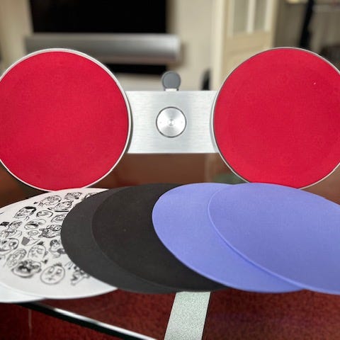Bang & Olufsen BeoSound 8 højttaler med de to runde front-højttalere og centerkontrol. Har vægbeslag bagpå og betjening i midten.