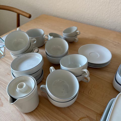 Birka Gustafsberg stel med tallerkener, skåle, kopper og kander i beige farve med mørkegrå kant. Enkelt design med matchende dele, fint som samlet sæt til bordet.