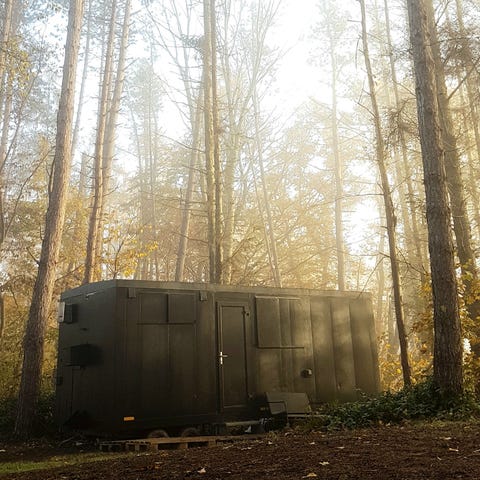Grønt skur/jagthytte på hjul med flere vinduer og dør i gavlen. Indvendigt er der lang bordplads, stole og lamper i loftet, så der er god plads til hygge eller pauser.