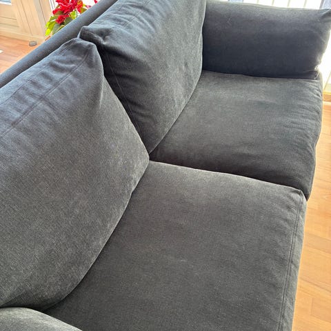 2 stk Sofa i bredriflet mørkegrå fløjl. Megalækker flydersofa fra Ilva