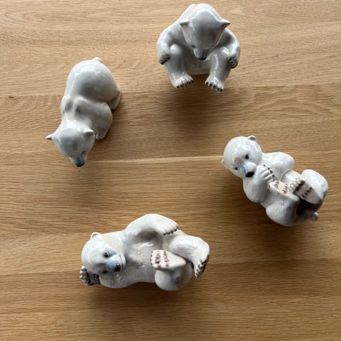 Fine isbjørne figurer i hvidt porcelæn fra Royal Copenhagen, både stor bjørn og unger. Har stempler under bunden og små filtpuder så de står stabilt på bordet.