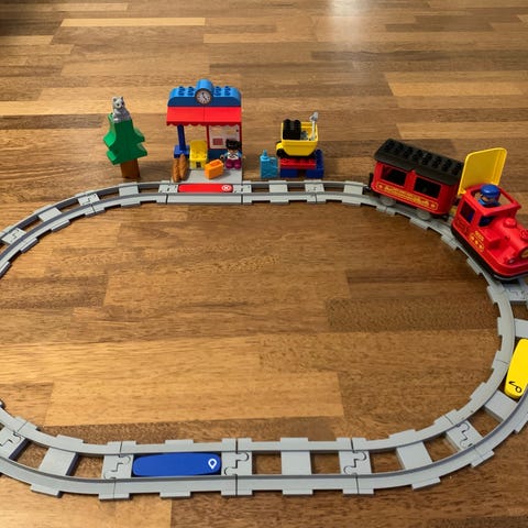 LEGO DUPLO togbane med blå lokomotiv, vogne, bil og figur. Med rund skinne, bom og små klodser som træ og grøntsager.