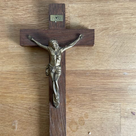 Smukt ældre krucifiks i træ og kobber.