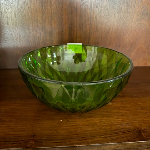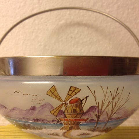 Vintage opalineglasskål formentlig fra Fyens Glasværk fra 1920`erne. Fremstillet i opalglas med håndmalet dekoration. Udstyret med metalkant og tilhørende hank. Fin stand - har dog en en lille ridse i bunden af skålen (indersiden) - der har måske været en lille luftboble, der er gået hul på